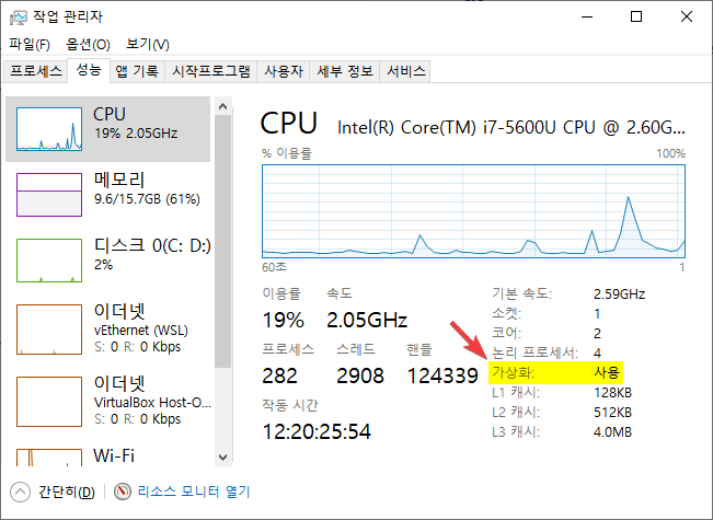 CPU가 가상화를 지원해야 도커를 설치할 수 있습니다. 작업 관리자를 실행한 후 가상화(Virtualization)가 활성화돼 있는지 확인하세요.